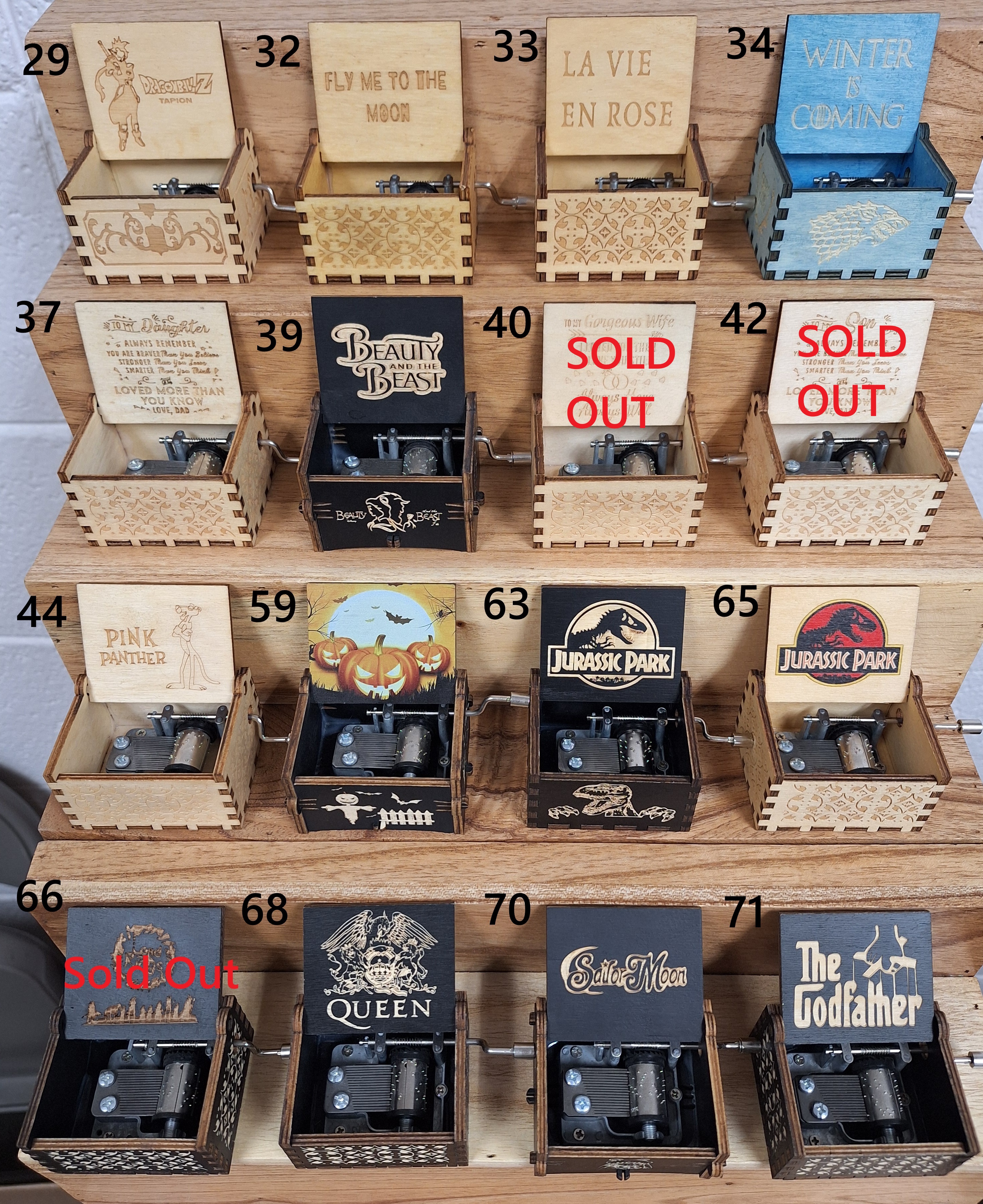 A very good way to order music boxes is getting 5 of the top 10 sellers for a total of 50 boxes. 10 of the top 10 for a total of 100 boxes. 5 of the top 20 for a total of 100 boxes. You can order exactly what you want and the quantities as well. This product is super-hot if you stay in the top 30 or 40 boxes. I have each music box taped in sets of 5 and that is the way I prefer to sell them but I do not mind separating them. This is just a preference because we sell a lot of boxes. bookviking@gmail.com